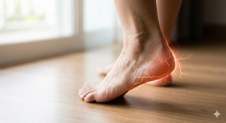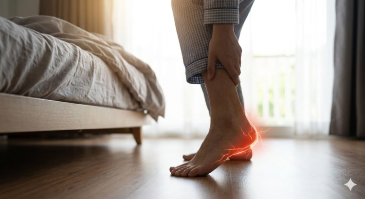 足底筋膜炎の最大の特徴は、朝一番の痛みです。寝ている間、足の裏は使われないため、硬くなった筋膜が少し縮まった状態で安定しています。しかし、起床して一歩目を踏み出すとき、体重によってその筋膜がいきなり急激に引き伸ばされます。