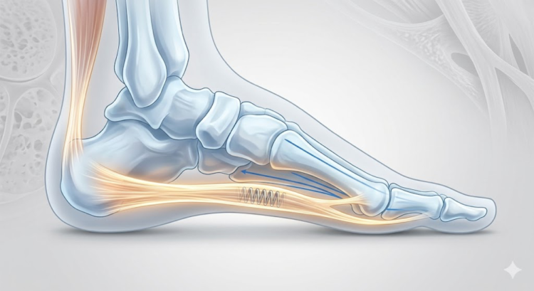 私たちの足裏には、かかとの骨から指の付け根までを繋ぐ「足底筋膜」という厚い膜が張り巡らされています。これは、歩く時や走る時に地面からの衝撃を吸収する**「クッション」であり、同時に土踏まずのアーチを支えて前進する力を生み出す「バネ」**のような役割を果たしています。