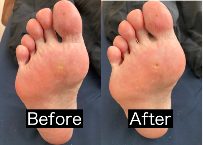魚の目は角質を削って綺麗にして、芯取り除いても時間がたつにつれて魚の目が再発してしまう方がいらっしゃいます。