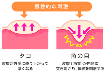 タコは、皮膚が厚くなり固くなるだけですが、魚の目は固くなった皮膚の中央に芯ができ、痛みを伴うようになります。