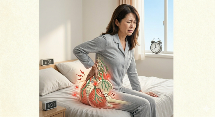 朝の腰痛の原因は、単に「動かないから」だけではありません。睡眠中の筋肉の硬直、血行不良、そしてそれらによる神経の圧迫が組み合わさって、起きがけの激痛を引き起こしています。